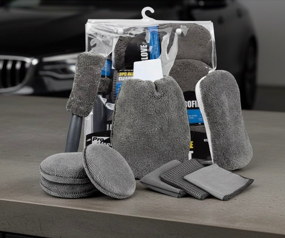 Dieses 9-teilige Autowasch-Set enthält alle wichtigen Werkzeuge für eine gründliche Fahrzeugreinigung. Das Set umfasst einen grauen Mikrofaser-Auto- Wasch-Schwamm, ein Paar Autowaschhandschuhe, eine Reifenbürste, drei Wachstücher sowie drei Reinigungstücher. Die hochwertigen Materialien gewährleisten eine schonende und effektive Pflege für den professionellen Einsatz.